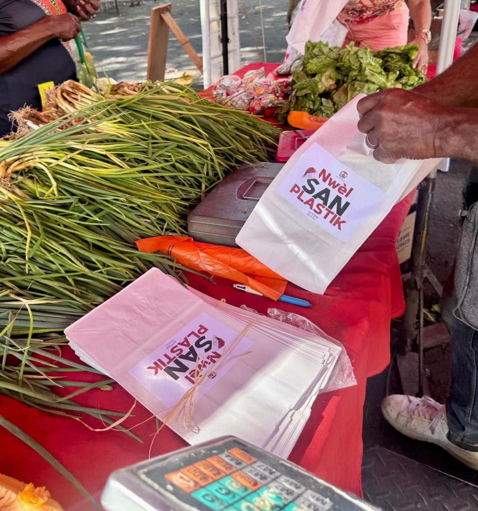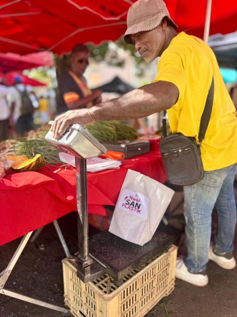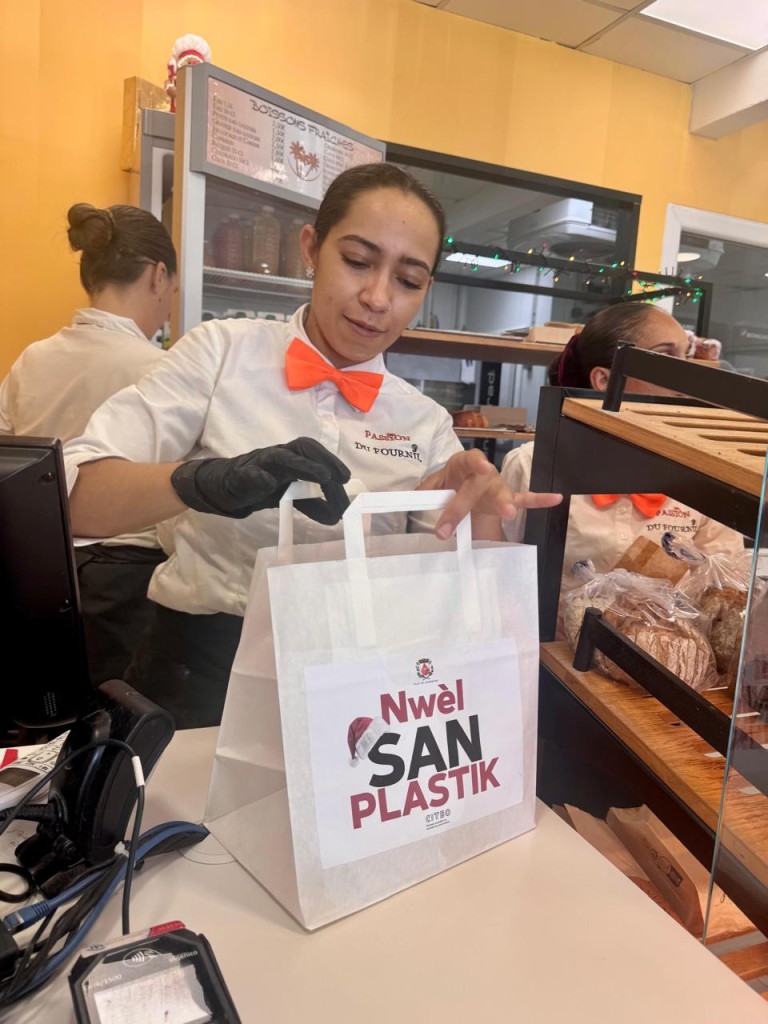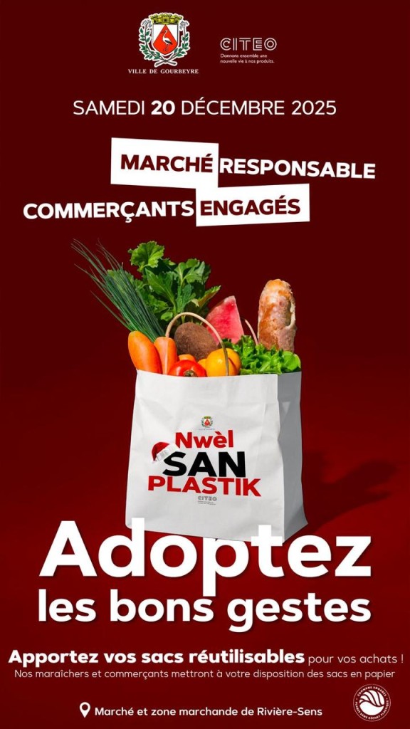 Ces sacs, recyclables et triables, étaient destinés à remplacer les sacs plastiques habituellement utilisés pour la pesée des fruits et légumes, l’emballage des produits alimentaires ou la vente à emporter. Floqués des logos de la Ville de Gourbeyre et de CITEO, ainsi que de la mention « Nwèl san plastik », ils portaient également un visuel rappelant l’esprit festif de Noël.